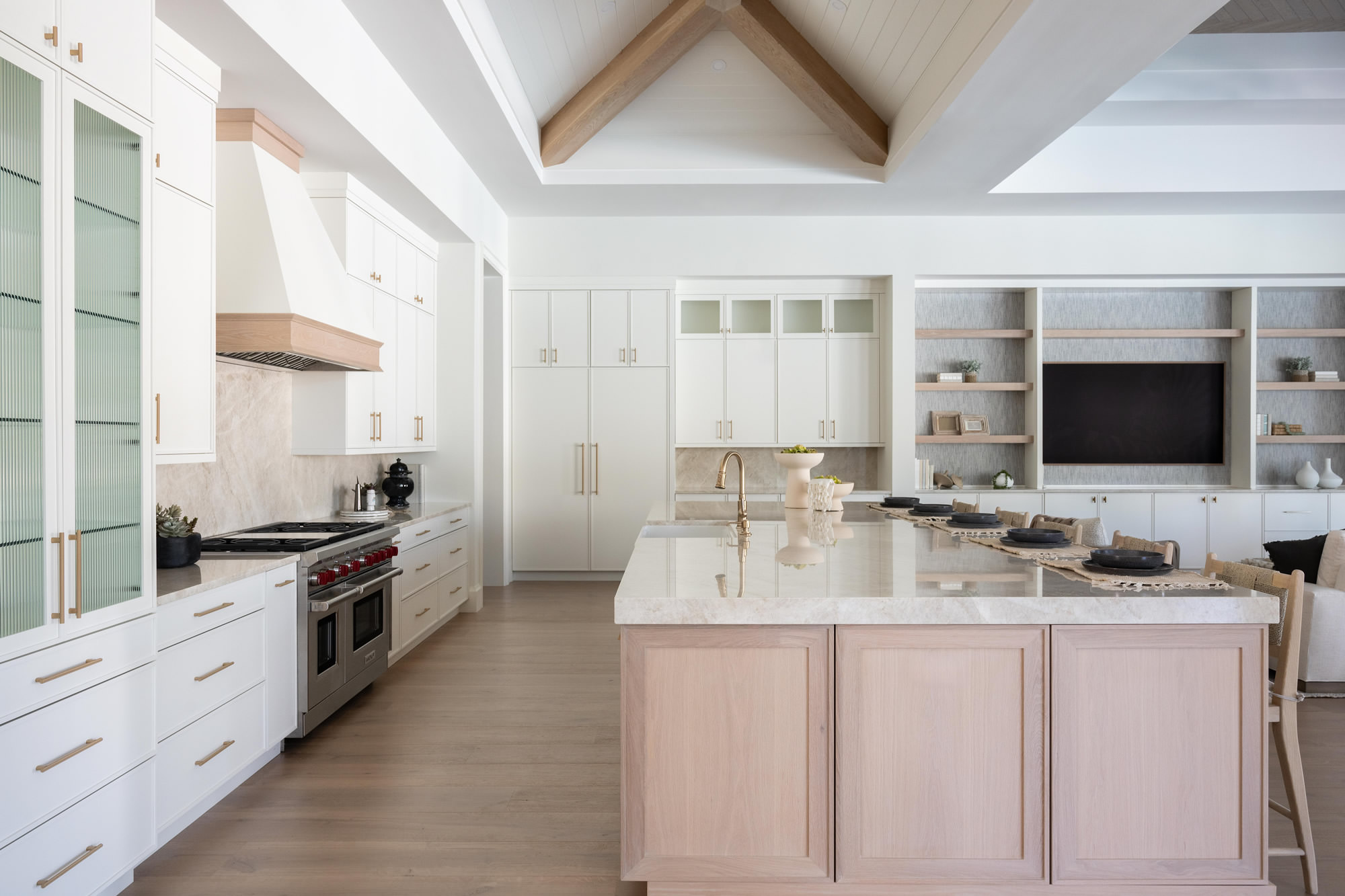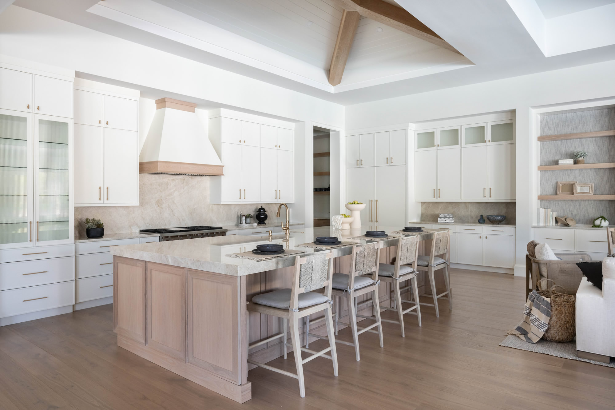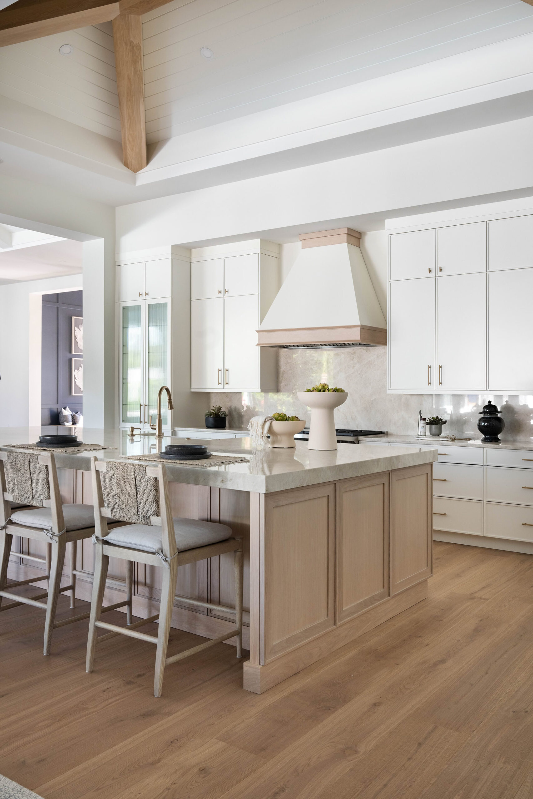 – Ceiling with White T&G and Added White Oak Beams to relate to the white oak island and floor