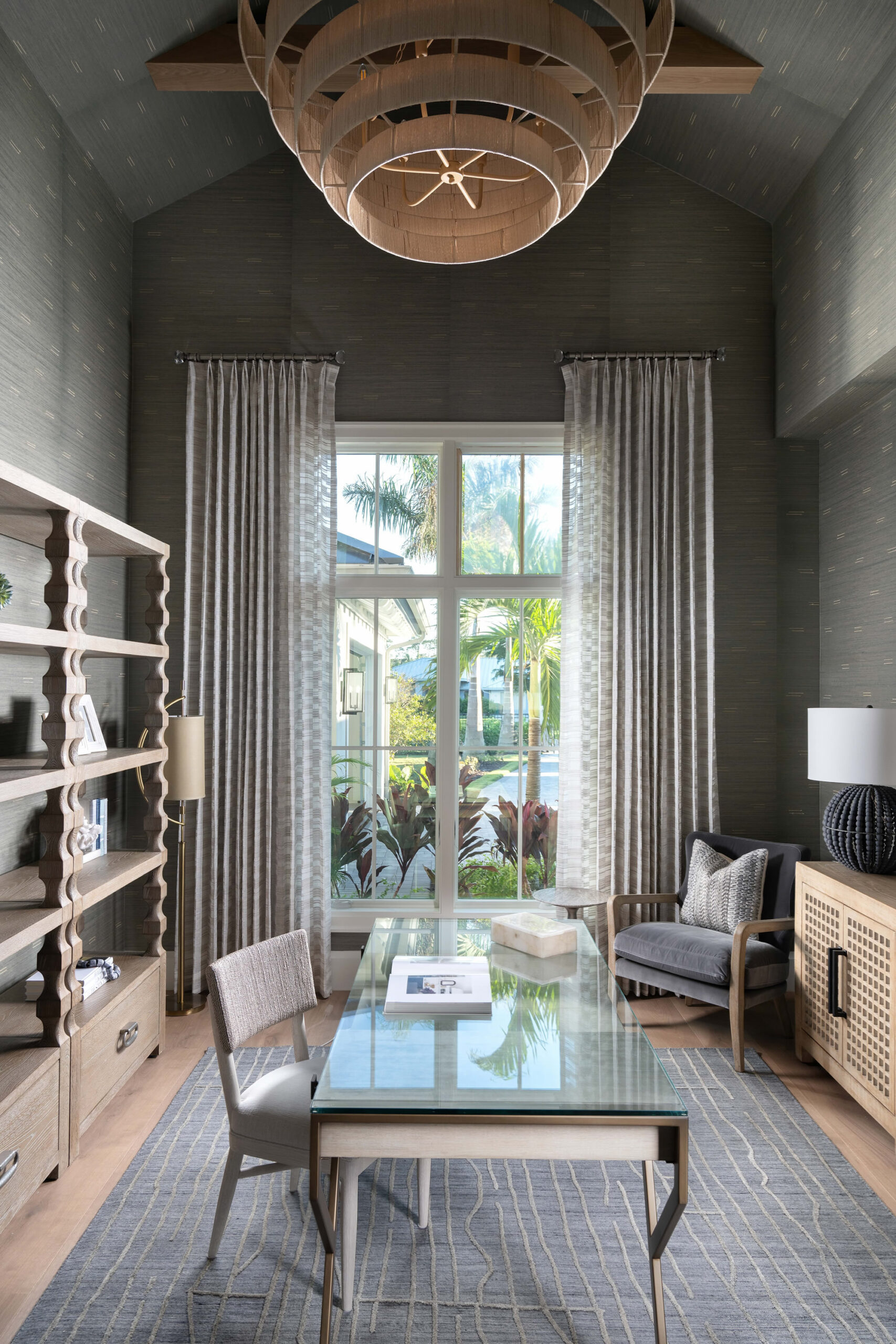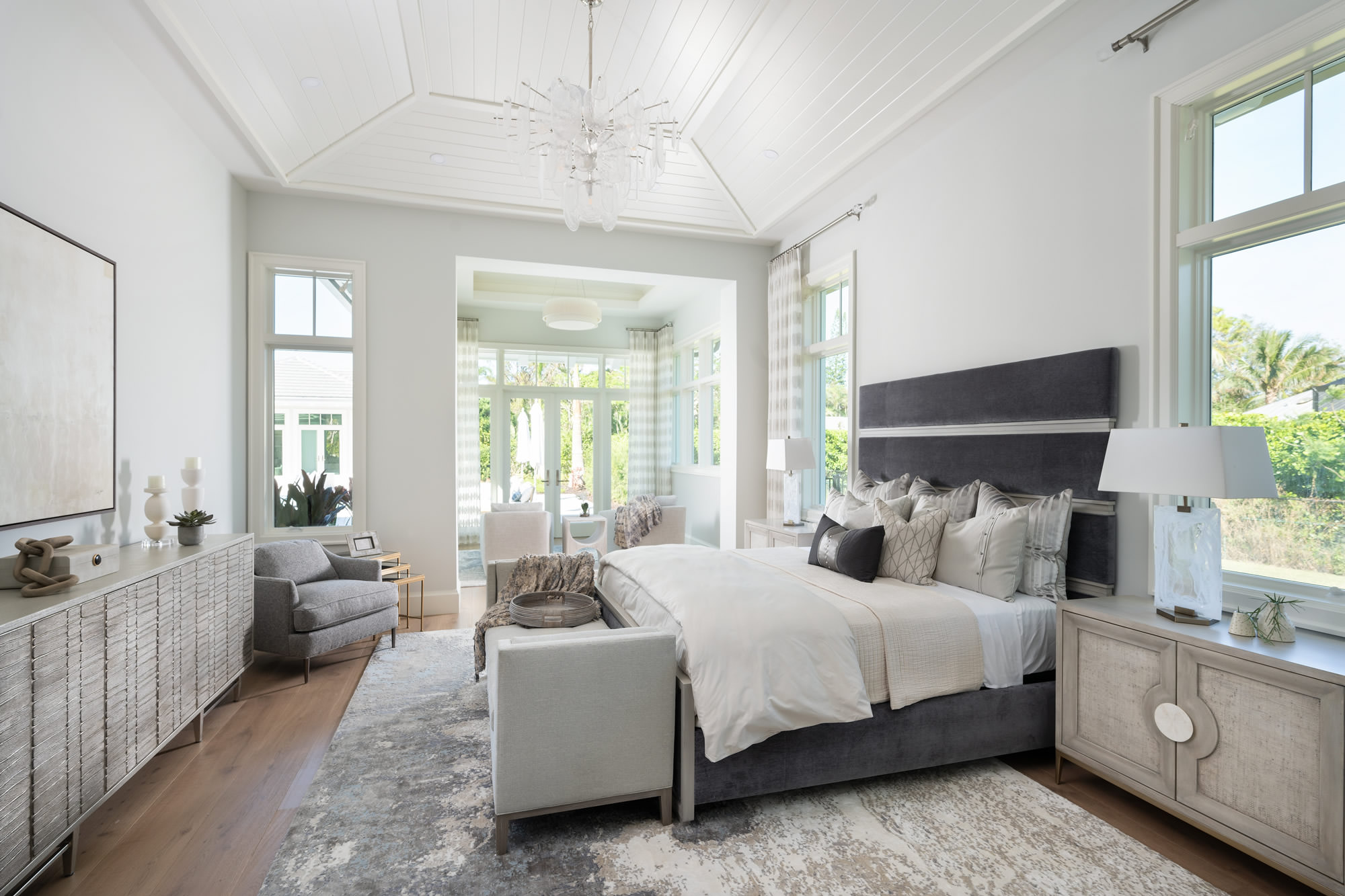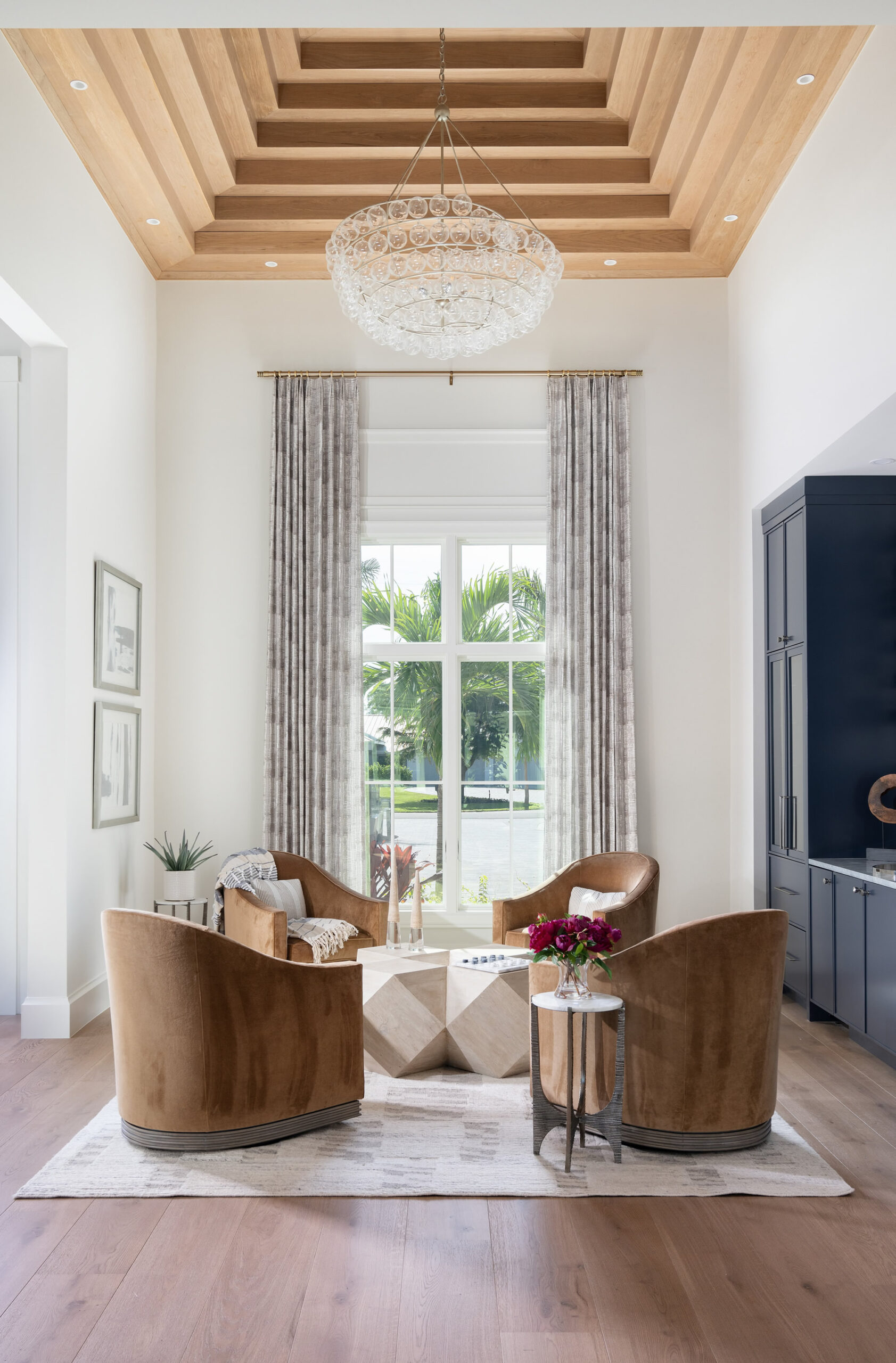 This home was a spec that we were given a pretty tight budget on the finishes and decor for a home of this size, but we were able to be creative and really add some custom features to make this home stand out and sell after only being on the market for a short amount of time. We really wanted to create a luxiourious home but still keeping the coastal flare that reflects the area we live. We did a lot of natural matte white oak mixed with a more traditional white v groove T&G. Ceiling details and millwork were very important to us, to really make this home stand out and look more like a custom, curated private residence and not a spec home. For the floors, we did custom herringbone inlays in the foyer and hallway to create some visual interest. When you walk in we added a wall of applied moulding with in a bold navy blue paint. In the lounge space we did a beautiful white oak stepped ceiling that really accentuated the ceiling height and added some warmth to the space. We did a beautiful navt blue bar that tied into the navy wall in the Foyer and accent the space with beautiful camel colored velvet swivel chairs, making this a great space to enjoy drinks or good conversation with friends. In the Study, we did a beautiful textured wall covering and over scaled natural pendant to create drama and turn your head when you walk buy this space to the Master Bedroom. In the Master Bedroom, we did a bold headboard to really create a refined space but softened it with beautiful sheer drapery. The Master Bath we did a combination of white oak cabinets with beautiful custom designed white reeded mirror frames that are accented by white plaster sconces. We really love the play of sophistication, yet calming natural woods, light fixtures and textured fabrics. We love to mix and match furniture, play with different wood species and really layer the bedding to create a curated custom home.