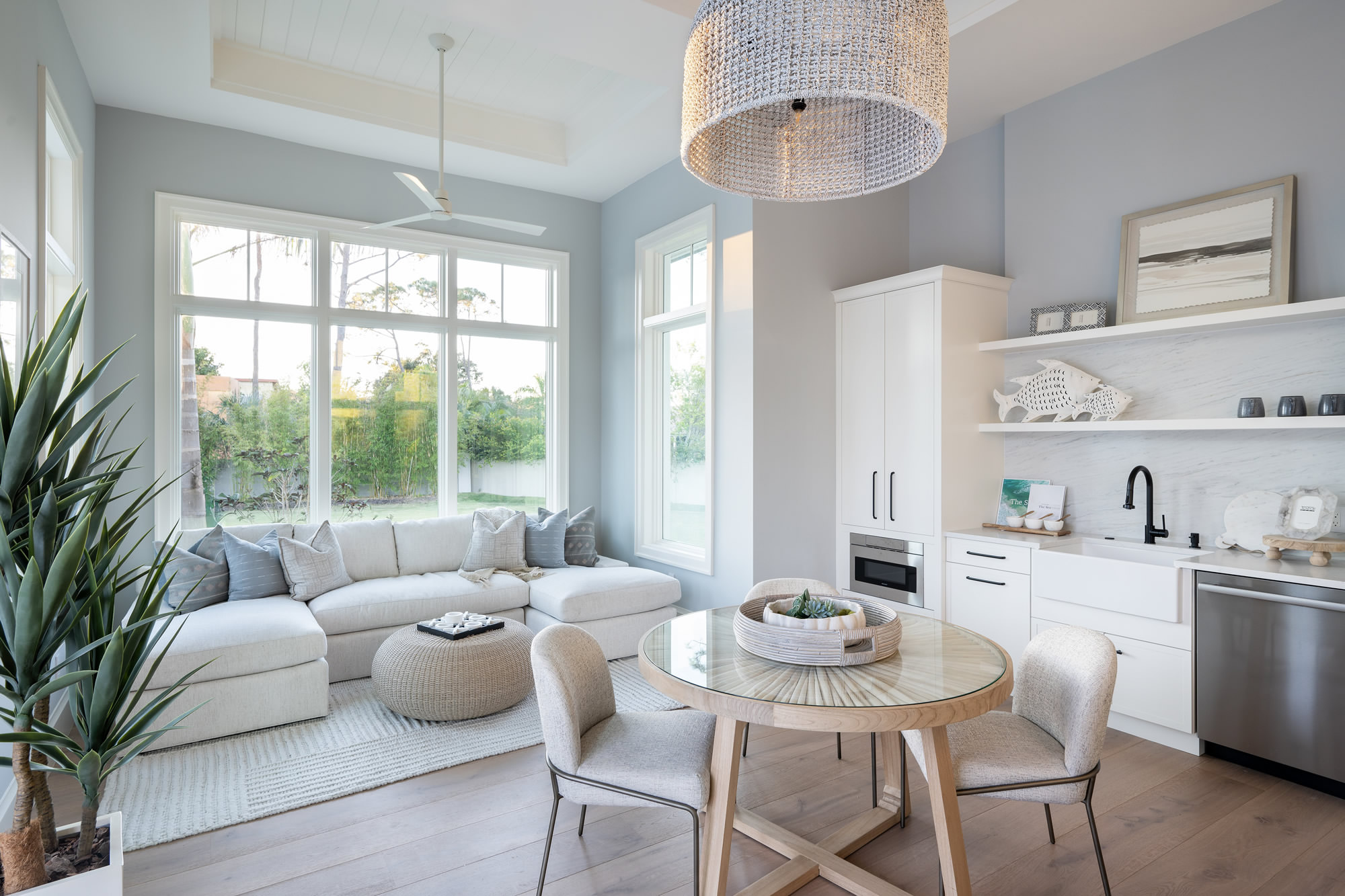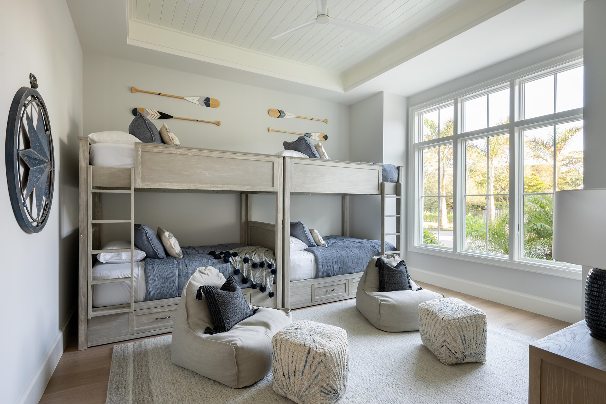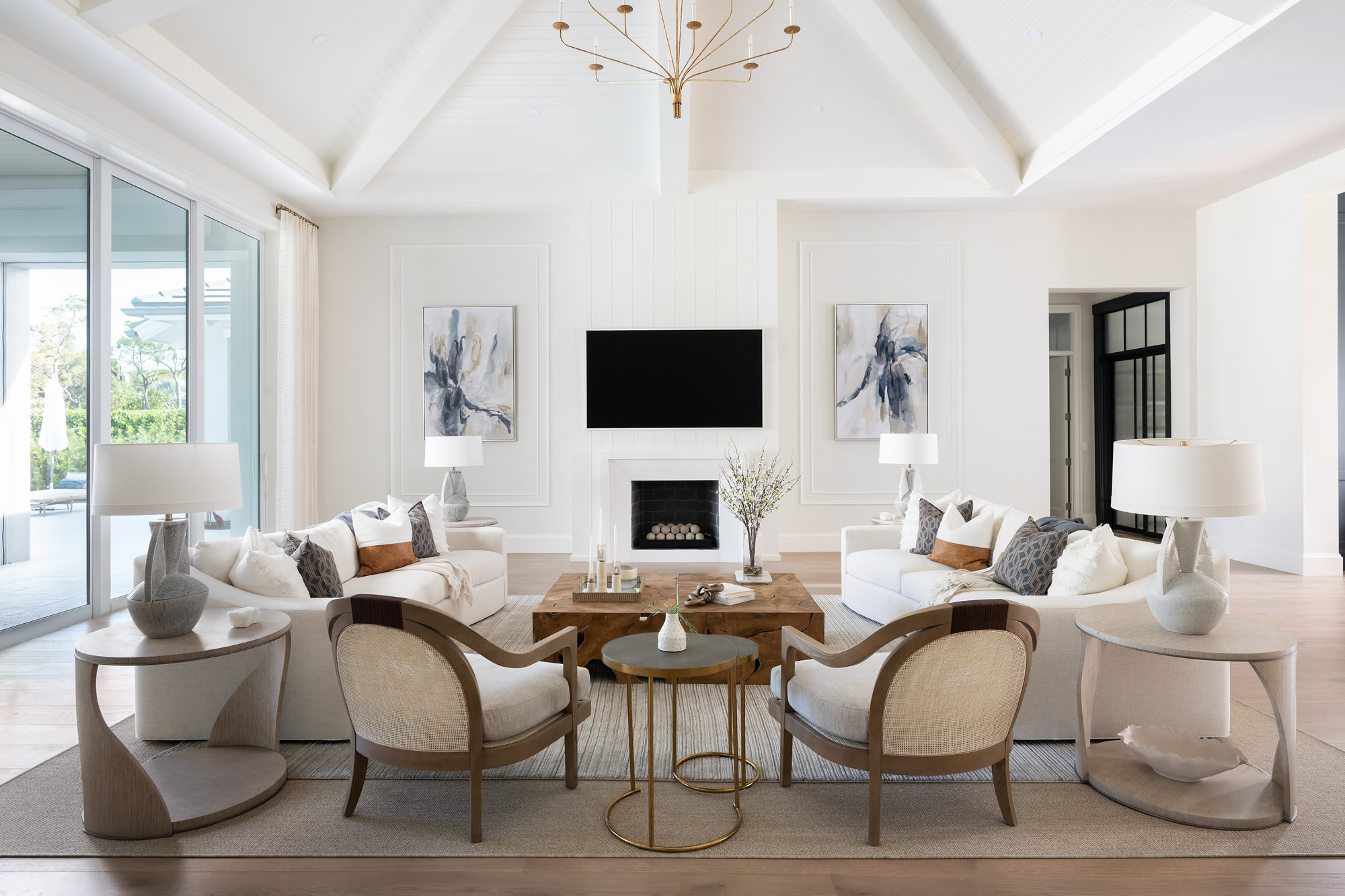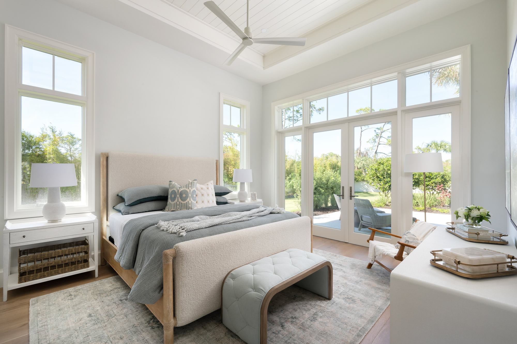This home was a spec that we were given a pretty tight budget on the finishes and decor for a home of this size, but we were able to be creative and really add some custom features to make this home stand out and sell after only being on the market for a short amount of time. We really wanted to create a luxiourious home but still keeping the coastal flare that reflects the area we live. We did a lot of natural matte white oak mixed with a more traditional white v groove T&G. Ceiling details and millwork were very important to us, to really make this home stand out and look more like a custom, curated private residence and not a spec home. For the floors, we did custom herringbone inlays in the foyer and hallway to create some visual interest. When you walk in we added a wall of applied moulding with in a bold navy blue paint. In the lounge space we did a beautiful white oak stepped ceiling that really accentuated the ceiling height and added some warmth to the space. We did a beautiful navt blue bar that tied into the navy wall in the Foyer and accent the space with beautiful camel colored velvet swivel chairs, making this a great space to enjoy drinks or good conversation with friends. In the Study, we did a beautiful textured wall covering and over scaled natural pendant to create drama and turn your head when you walk buy this space to the Master Bedroom. In the Master Bedroom, we did a bold headboard to really create a refined space but softened it with beautiful sheer drapery. The Master Bath we did a combination of white oak cabinets with beautiful custom designed white reeded mirror frames that are accented by white plaster sconces. We really love the play of sophistication, yet calming natural woods, light fixtures and textured fabrics. We love to mix and match furniture, play with different wood species and really layer the bedding to create a curated custom home.