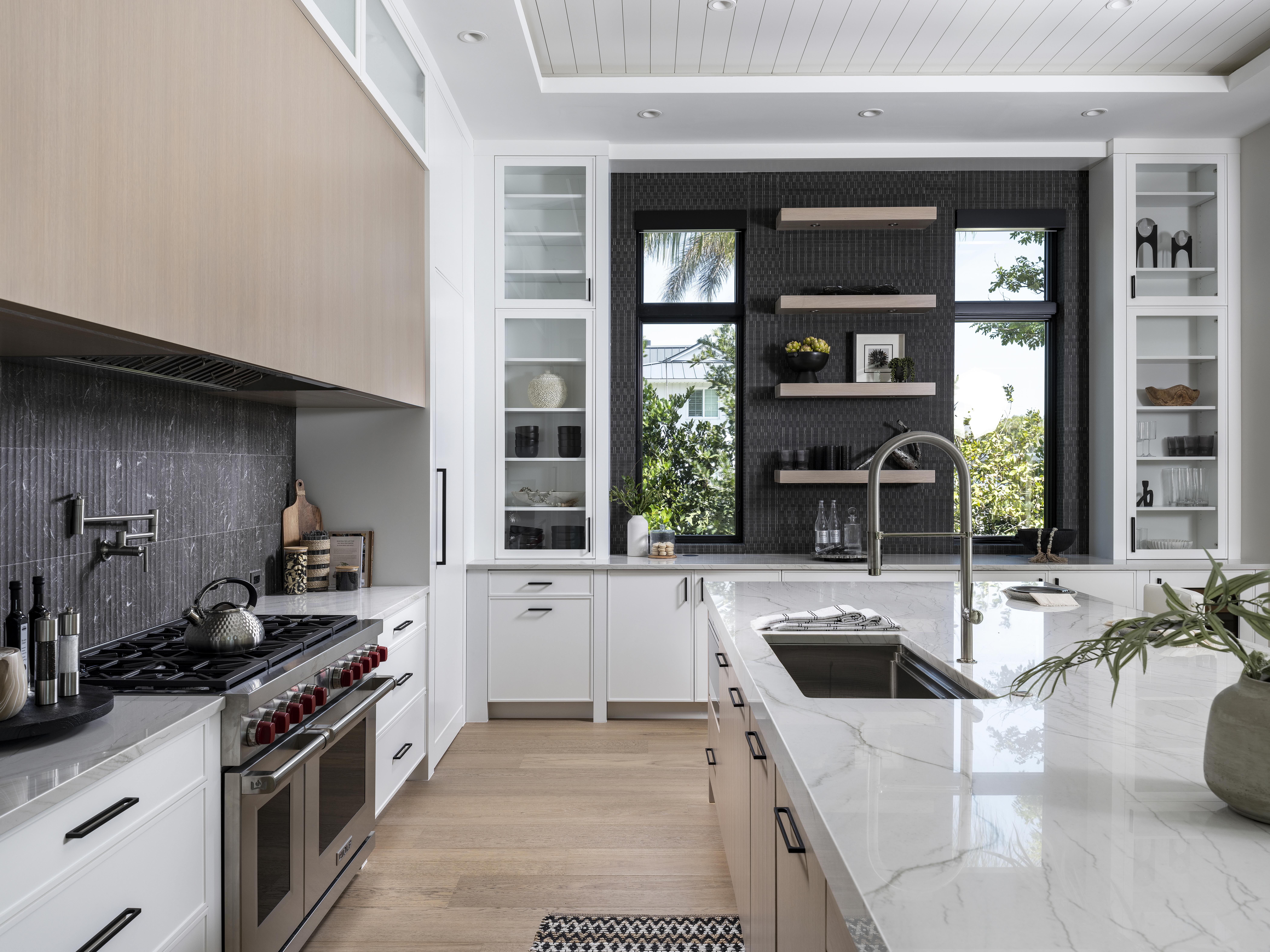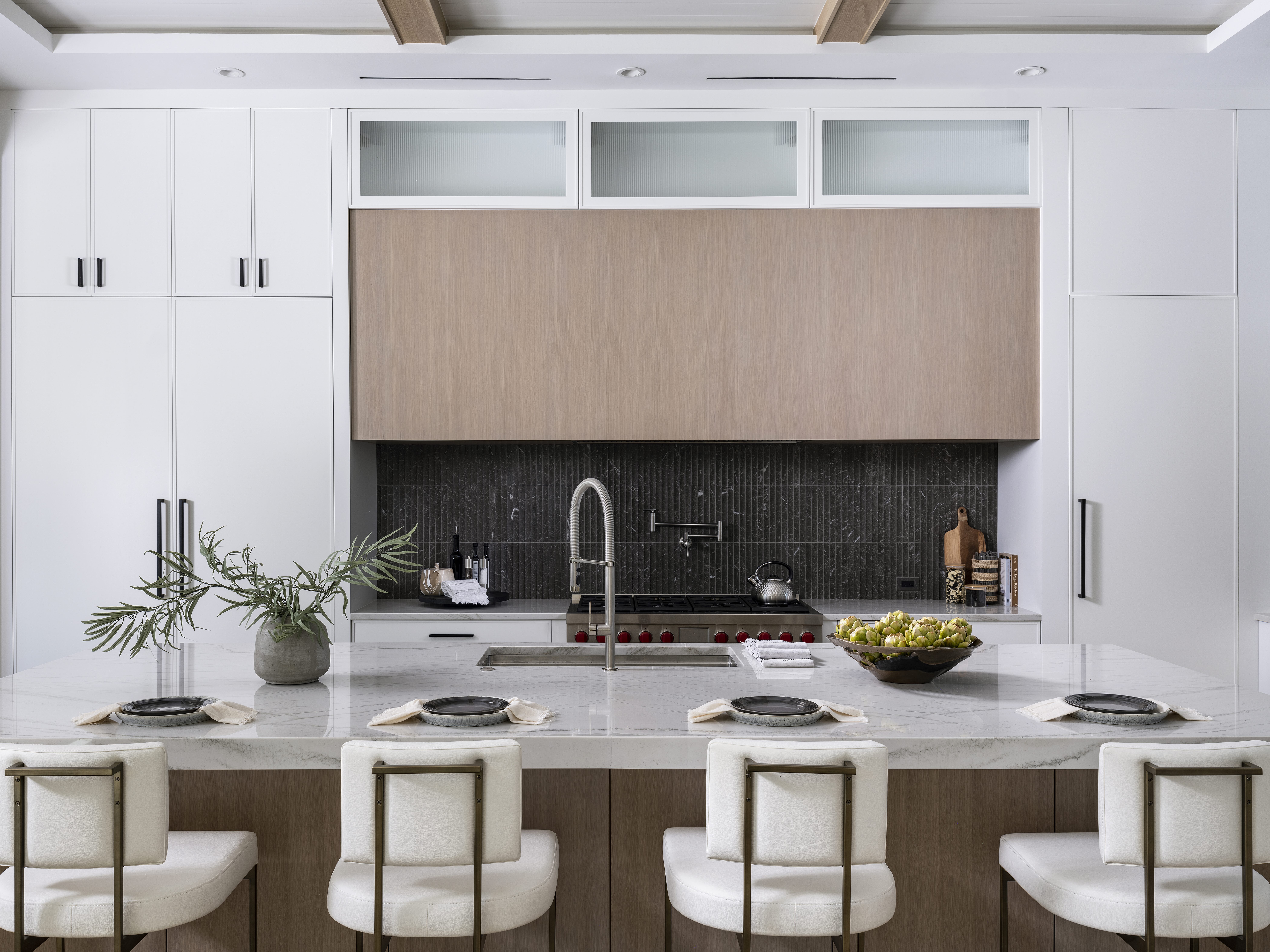 Some unique challenges in the space were addressing the overall layout as we had an opening into the pantry that we felt needed to be hidden as that is a work/storage place that should be able to be closed off when not in use as well as a wall with two windows. This made the appliance placement, range/hood placement, etc. a challenge. We decided to disguise the refrigerator/freezer as well as the pantry with hidden cabinet doors to help elongate the range wall and keep a smooth/clean appearance. For the window wall, we did flanking glass cabinets that are fully lit for a beautiful ambiance at night and we accented the entire wall with a beautiful Mark Alexander organic patch work textured wallcovering, to create a beautiful accent wall that you see as soon as you walk in from the Great Room to the Kitchen. We added riftcut white oak cabinets for some dimension and to accessorize. The shelves have built-in accent lighting to show off the accessories and create a beautiful ambiance. To provide protection from the sun when it is rising in the morning, we added shades that are motorized and completely hidden in black boxes that blend away and look like a part of the windows. We did not do any hanging fixtures of the island as we felt that would distract from the beautiful window wall as well as call more attention that the back wall was asymmetrical to the island.