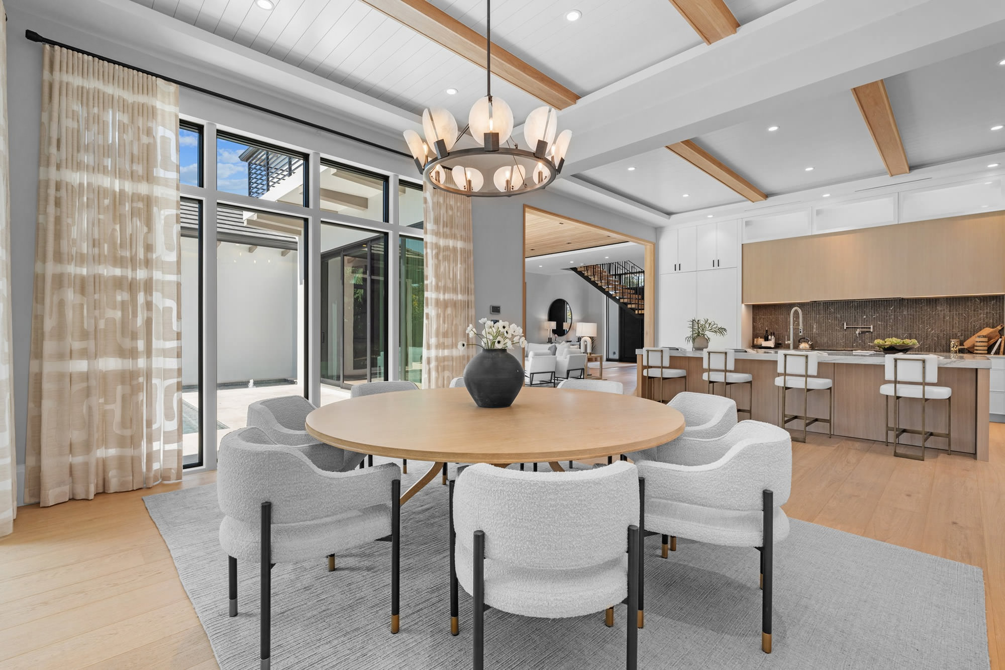 • Mixed Metals – Polished & Stainless architectural/industrial styled faucet, matte black hardware and subtle accents of antique brass in the stools and dining chairs