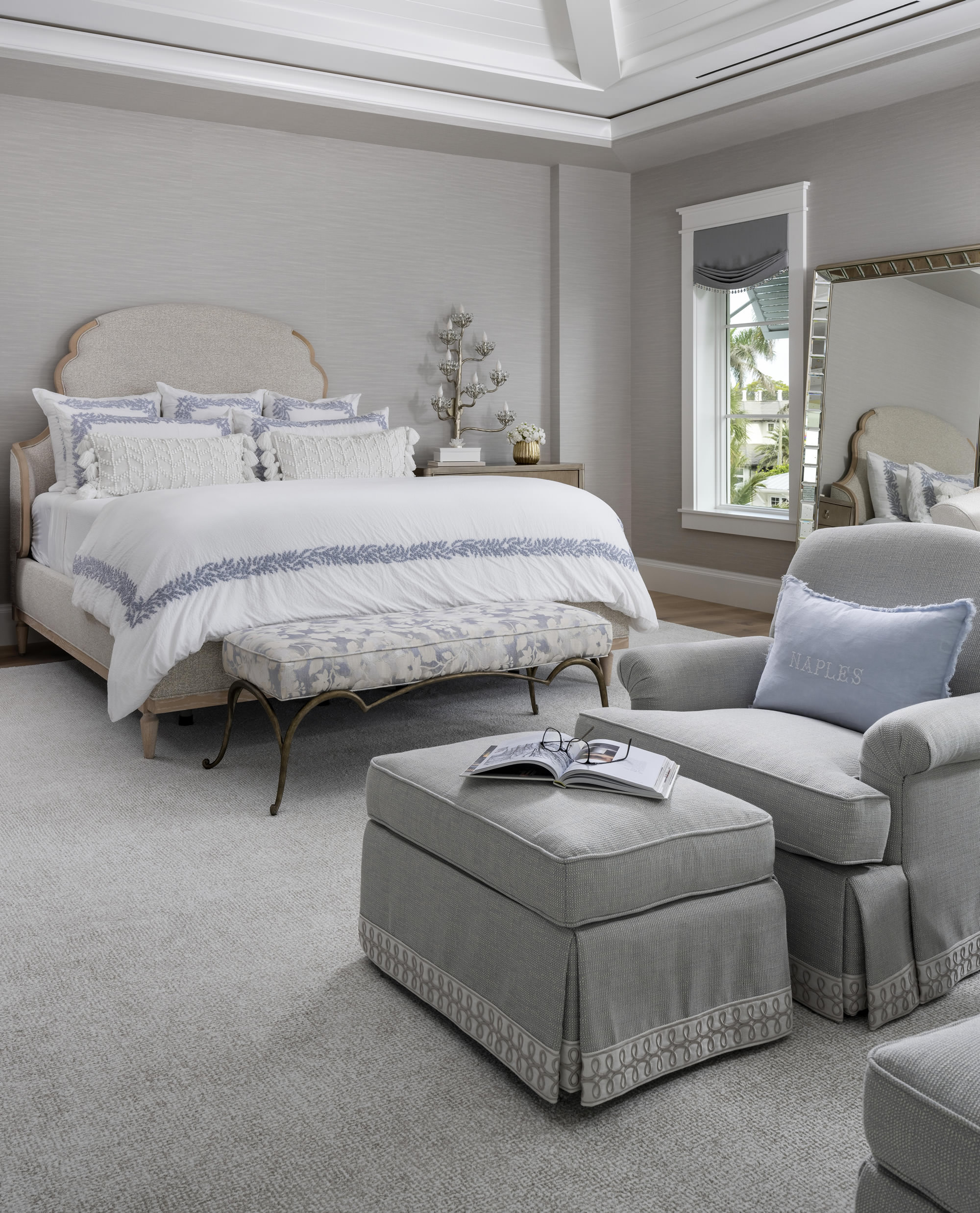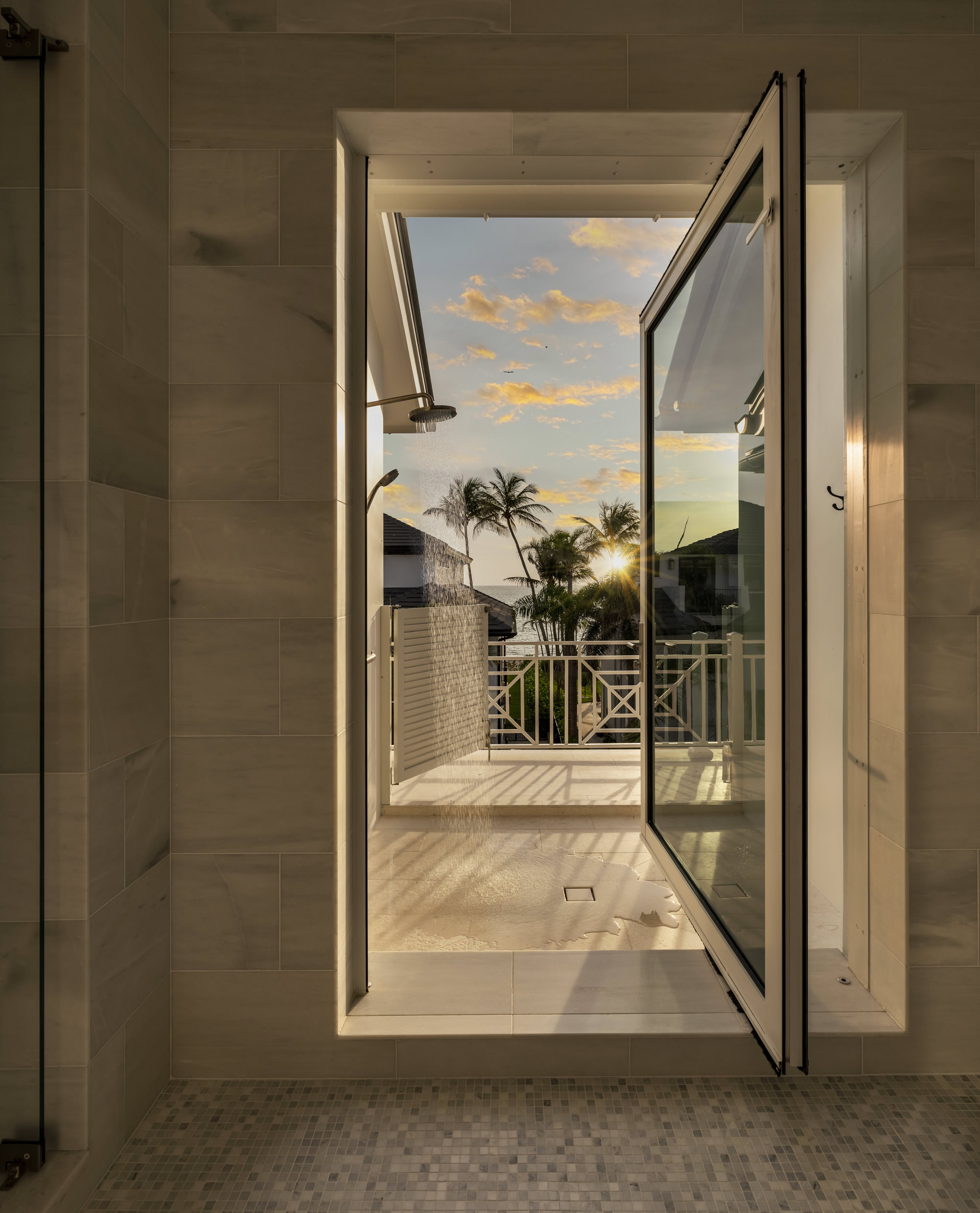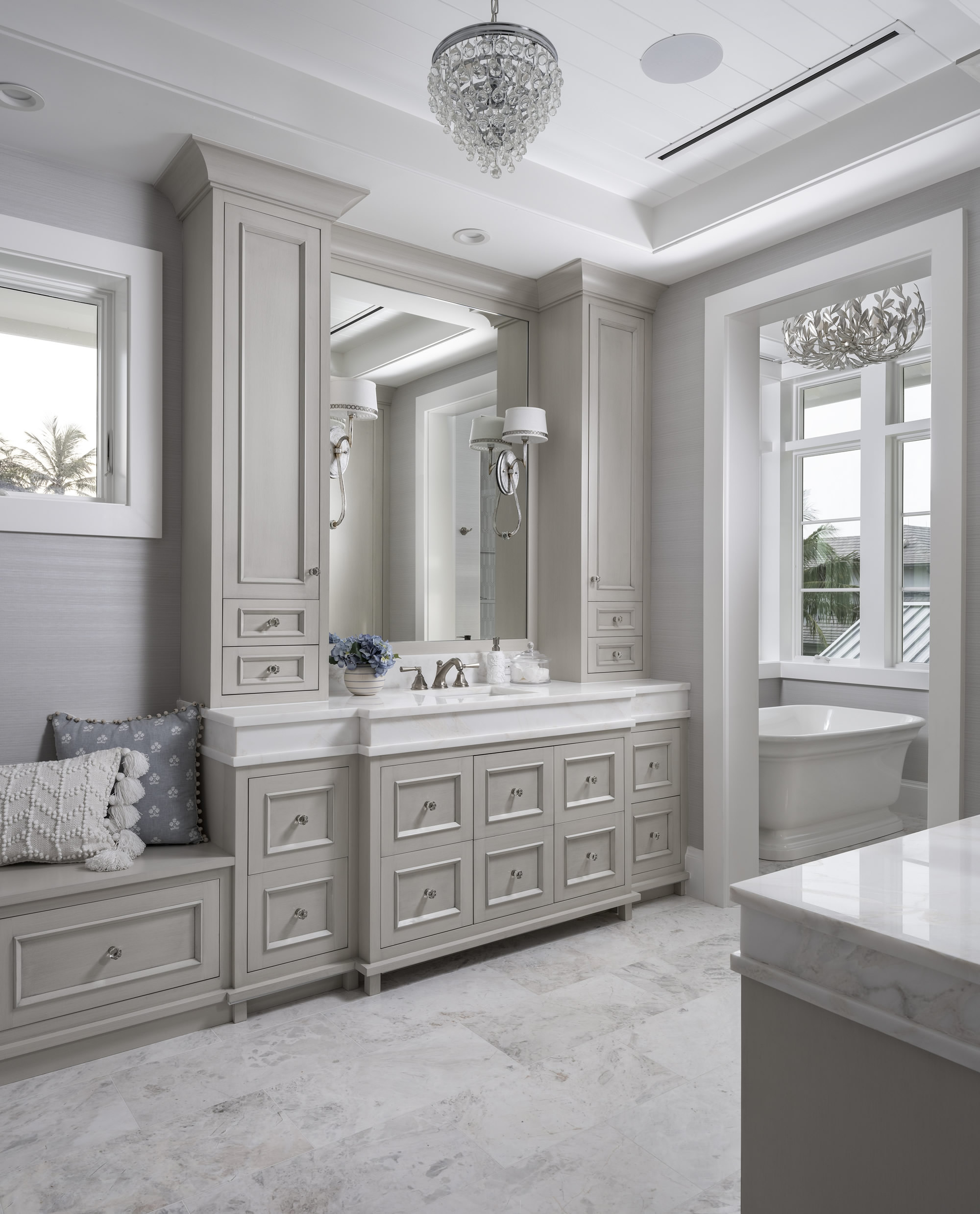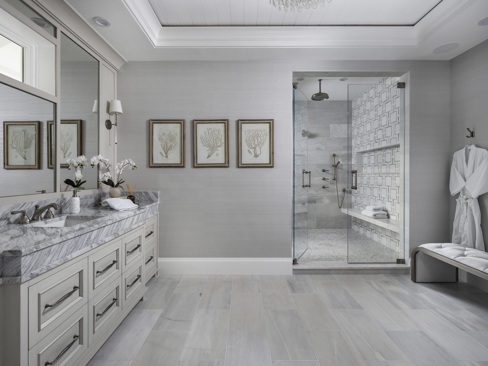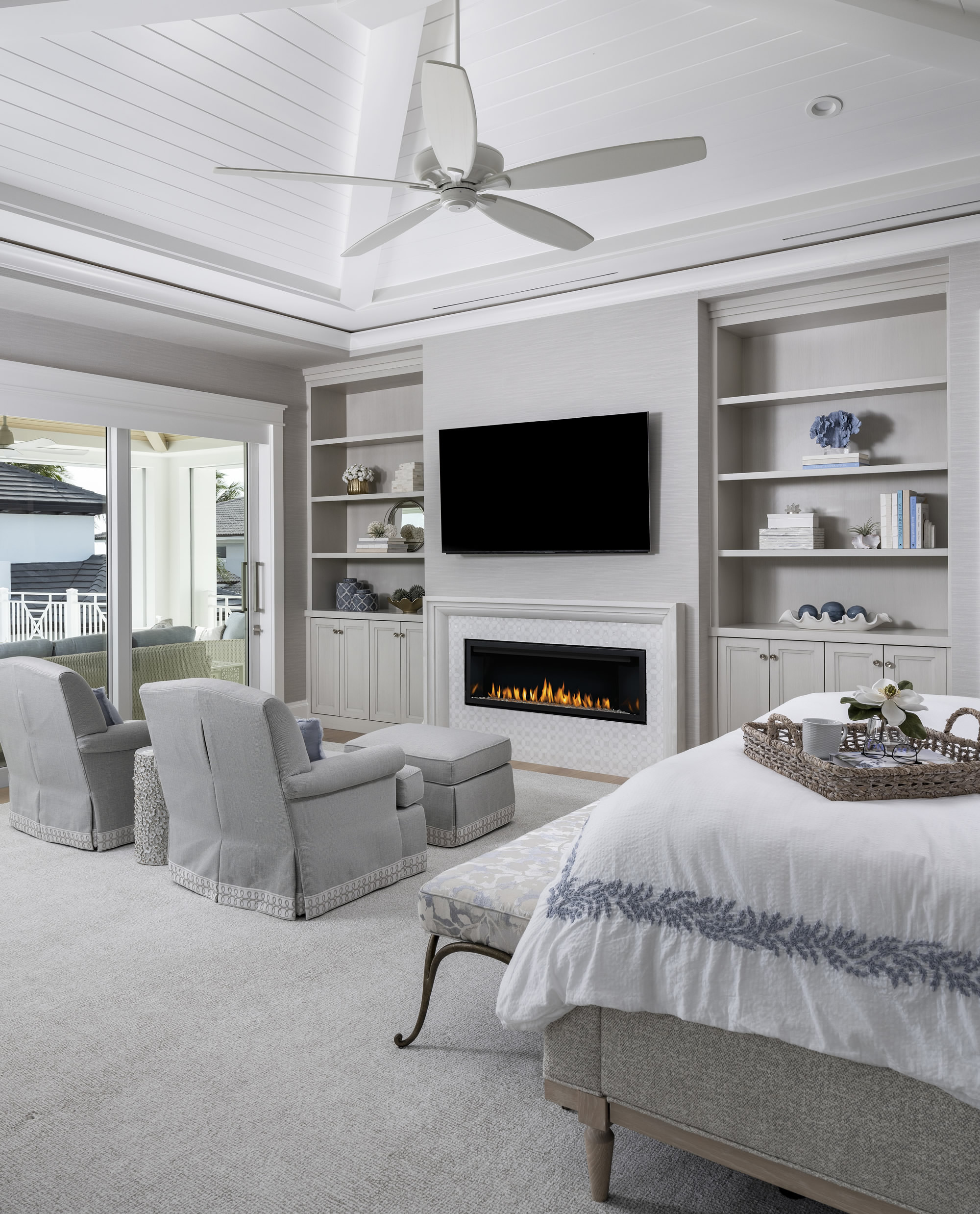 The Master Suite was a big challenge because of its size and wanting to take advantage of the view, but still have a nice quiet space for relaxing and enjoying the fireplace and TV. In the owner’s baths we used coordinating marbles (while keeping his and hers slightly different and curated) – we added some extra detail with thick countertops that had custom designed details, that really made these spaces feel special and sophisticated.