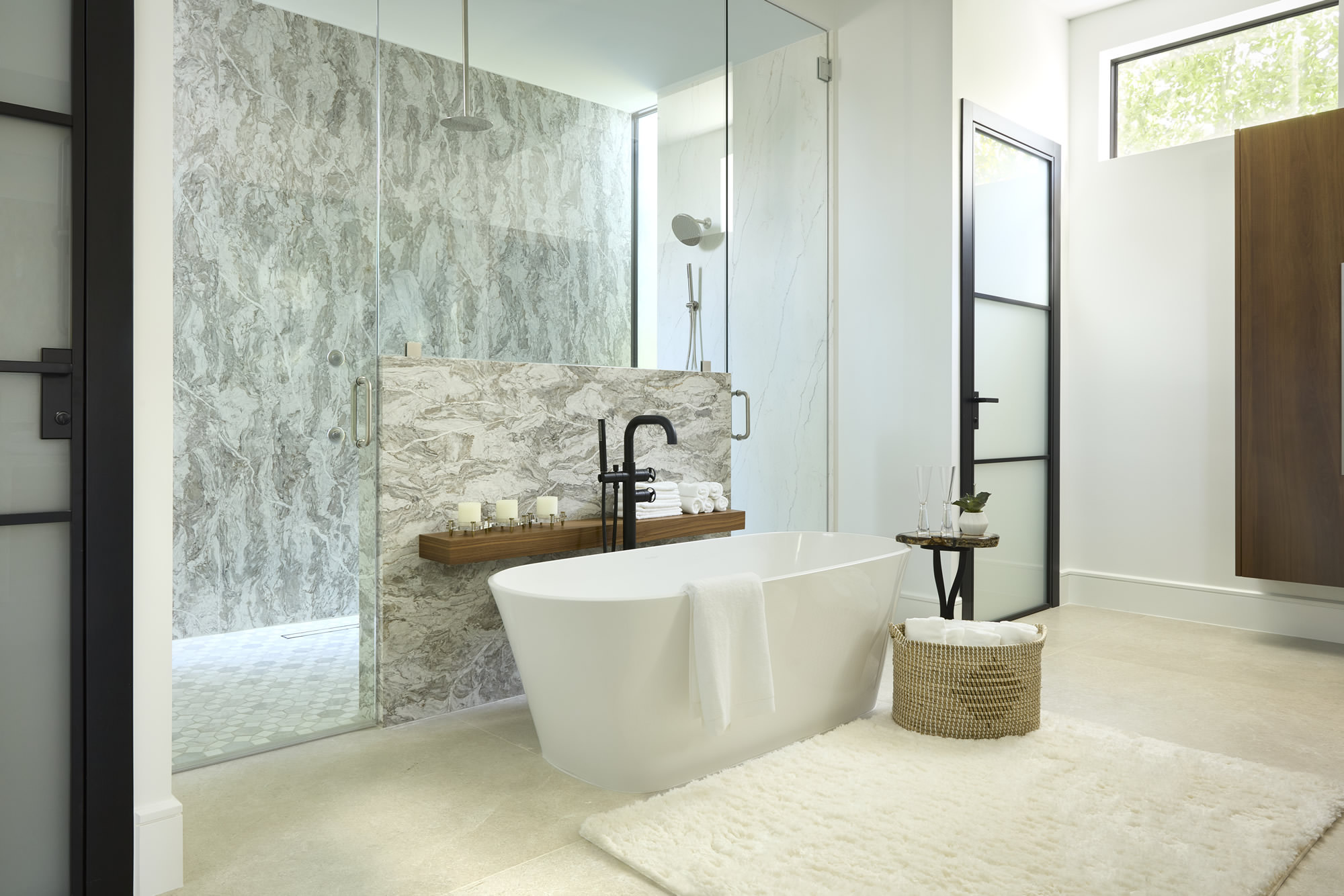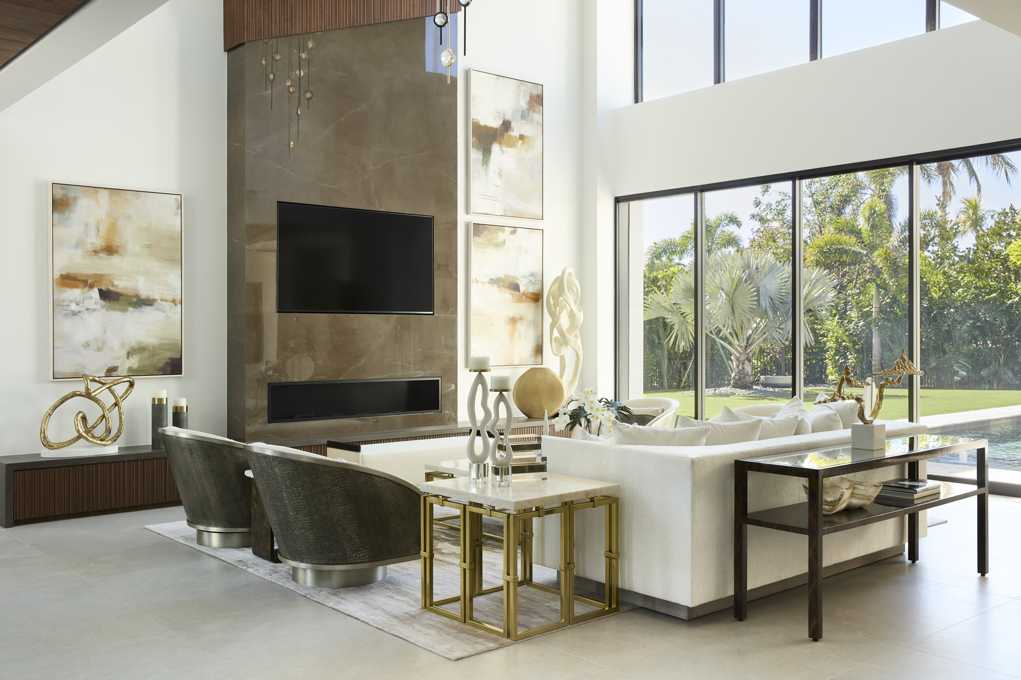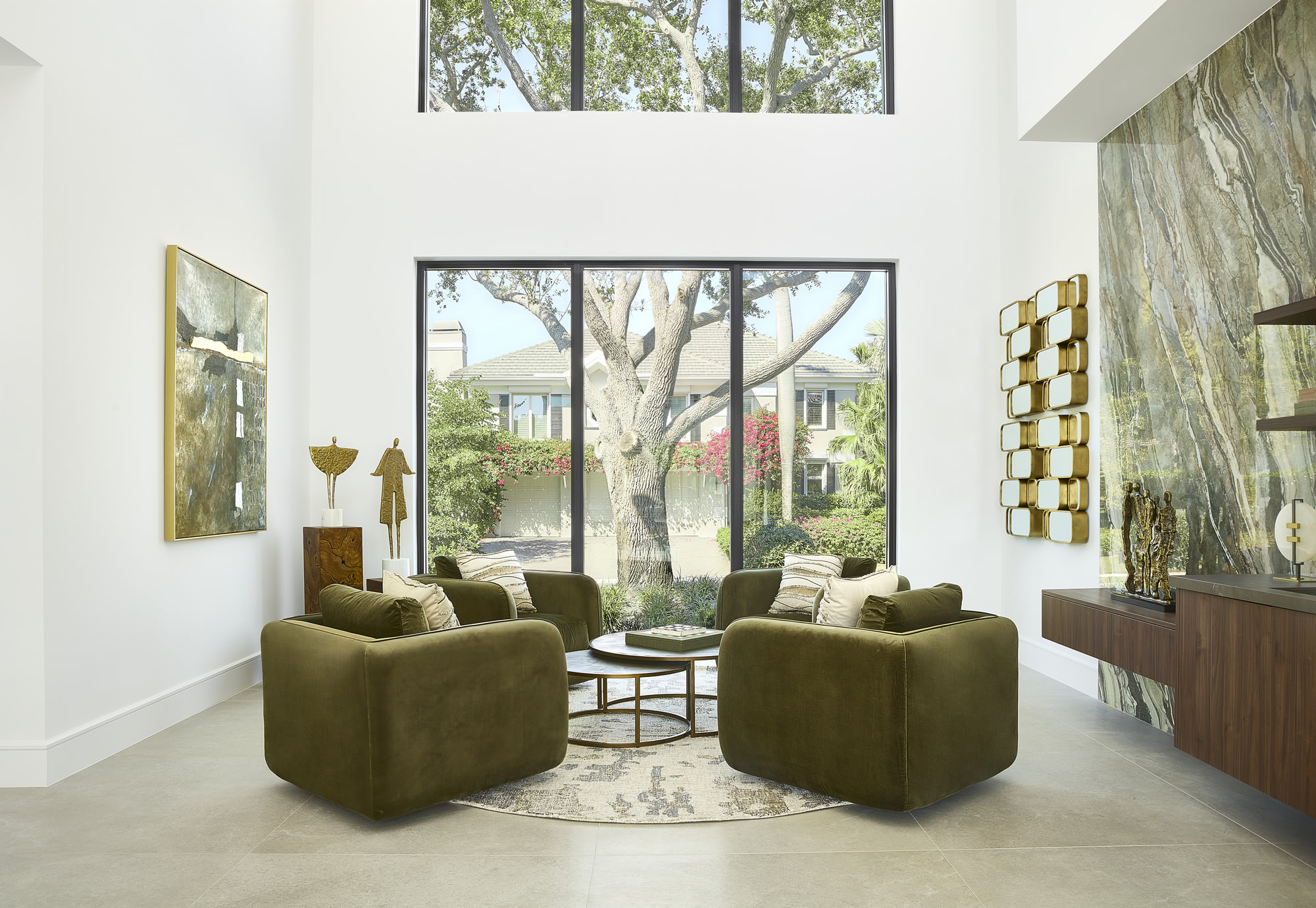 At the heart of the home, off-white upholstered furnishings provide both comfort and contrast as they face the striking focal point—the marble fireplace wall. Mixing metals & organic textures accented with subtle green pull the room together.