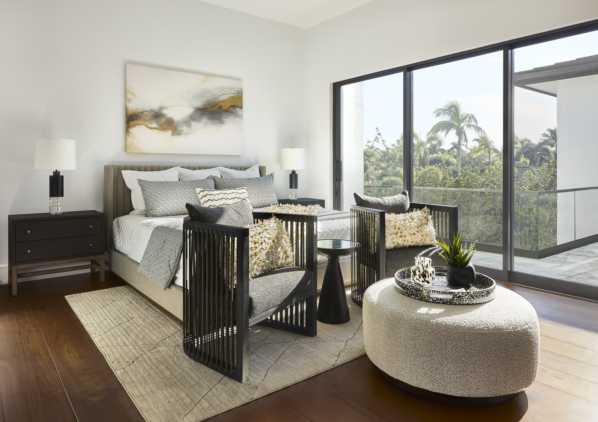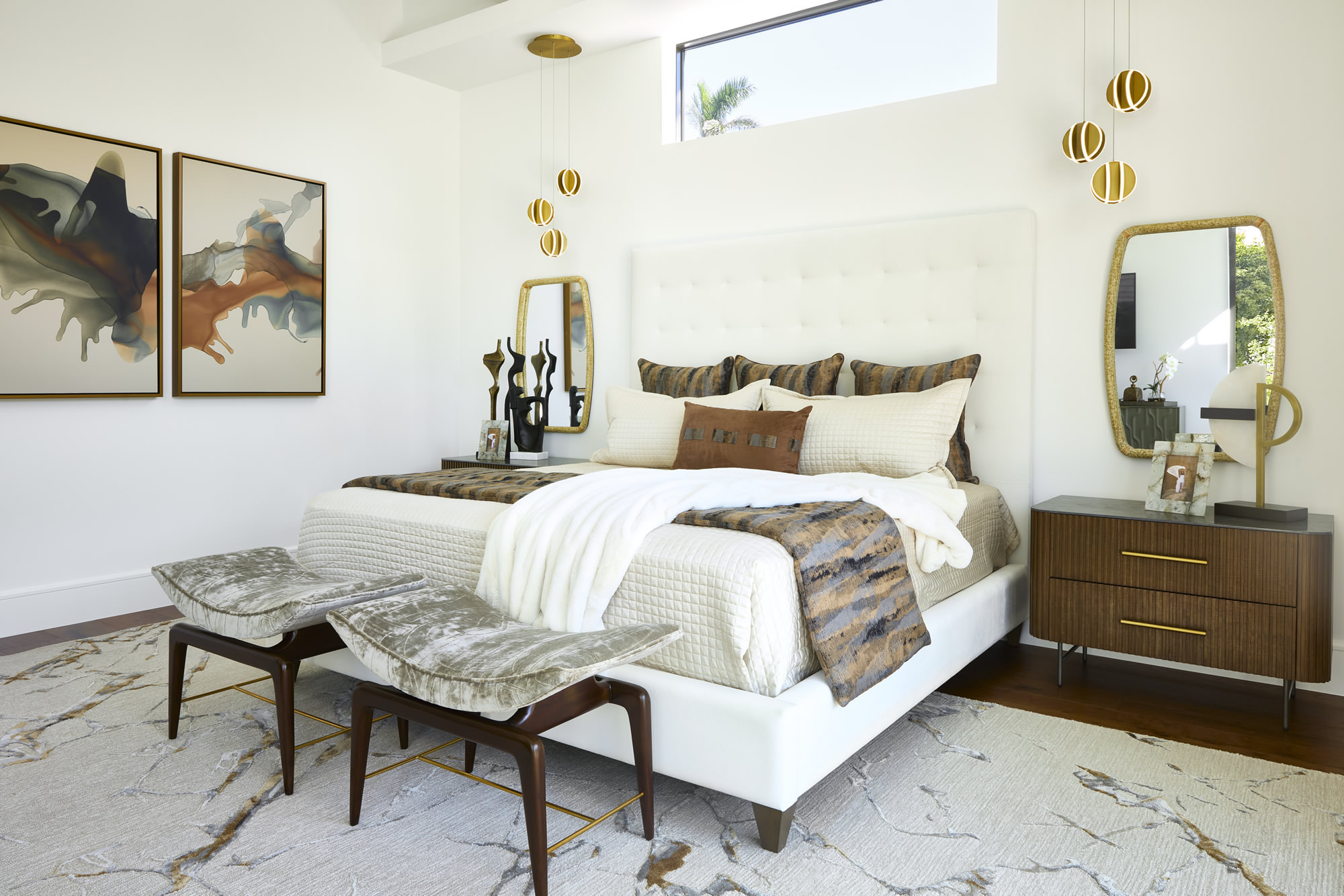 The architectural foundation embraces an elevated mid-century modern style, seamlessly paired with sophisticated interior elements that reflect a sense of timeless elegance. Soft, neutral textiles and layered textures enhance the sense of serenity in the space, while natural light filters in to highlight the richness of the wood and the simplicity of the design. The result is a private retreat that feels both elevated and effortlessly comfortable—an ideal sanctuary within a home designed for rest, relaxation, and refined living.