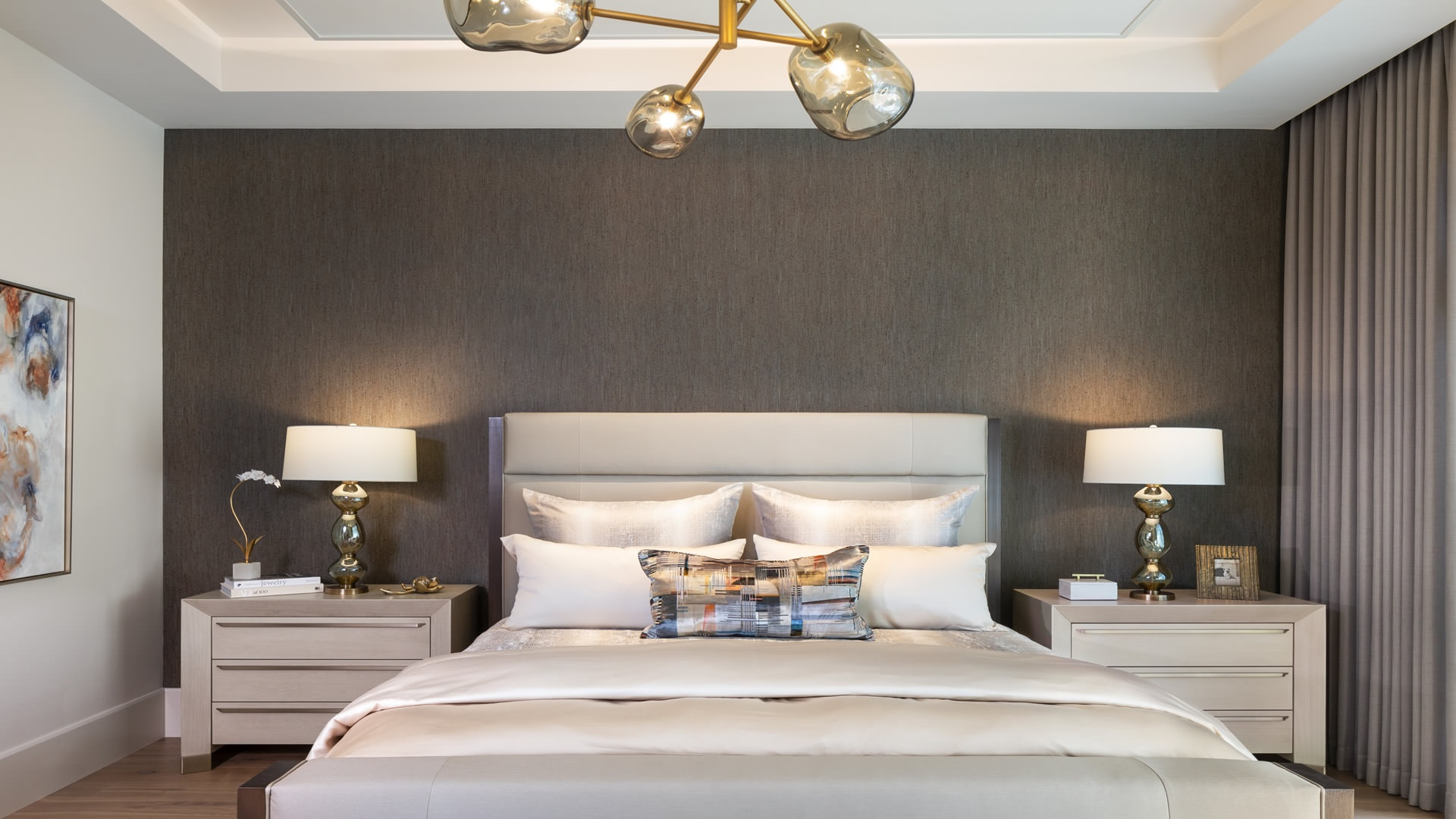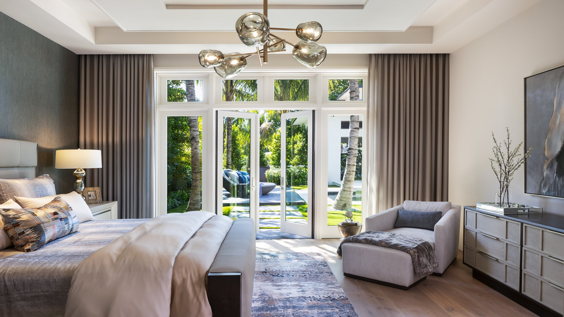 European white oak flooring, textural charcoal wallcovering, rich cashmere and silk evoke luxurious calm in the bedroom, where French doors, transoms and sidelights welcome natural sunlight while leading to a sunbed by the pool. A multi-stepped dropped ceiling provides a canvas for a contemporary lighting fixture; motorized blackout shades and draperies elevate serenity and relaxation.