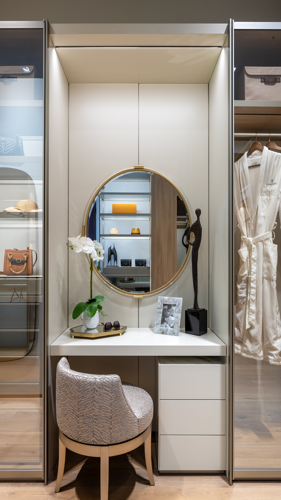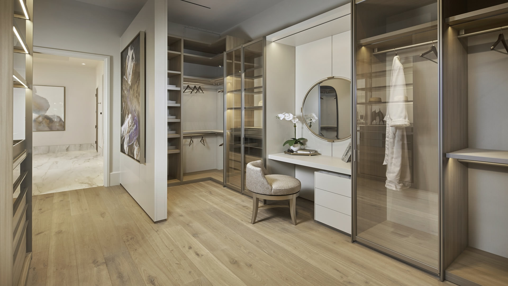 The 360-degree walk-in closet, which connects bedroom and bathroom, epitomizes innovation and the highest level of luxury, emulating the look of a high-end boutique with glass displays, wood and smoked-glass finishes, champagne-tinged hanging rods and a variety of custom built-ins expanding display options, storage solutions and functions. The space also integrates a makeup vanity and motion-sensor lighting.