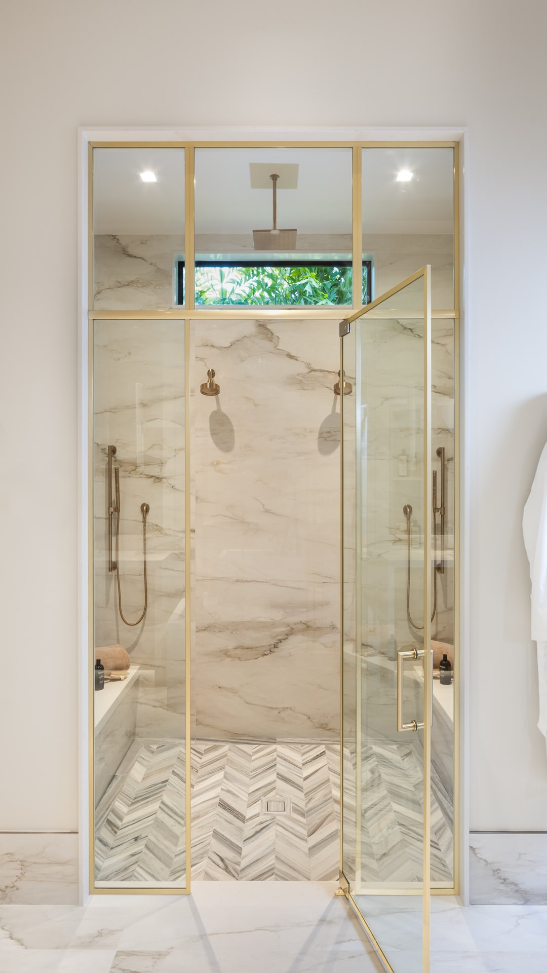 Sophisticated golden bronze, introduced in sconces, hardware, art, accessories and the shower frame, imparts a touch of elegance. Thoughtful details, including 10-inch baseboards with nickel-trimmed schluters and recessed medicine cabinets cleverly hidden in the trio of vertical plate mirrors above each vanity, add finishing touches. The shower floor’s chevron floor in shades of gray and white also adds eye-pleasing movement.