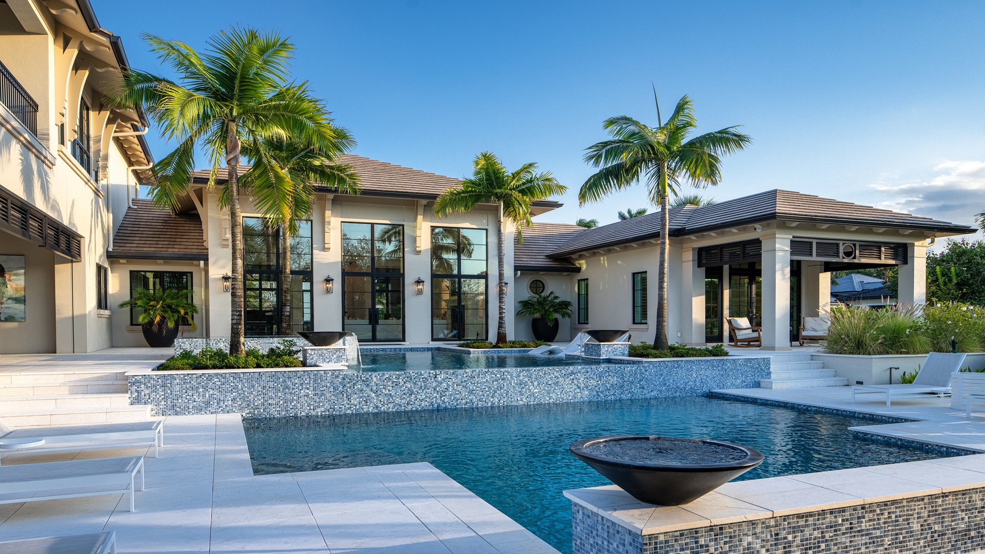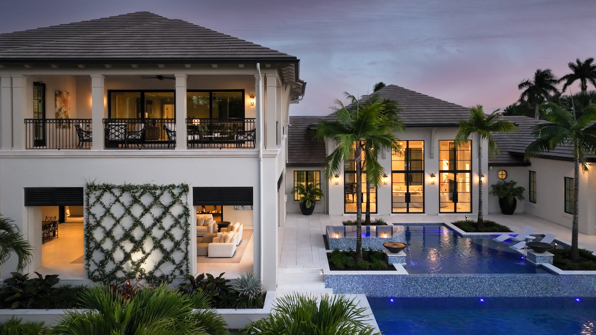 Seamless indoor-outdoor connections were paramount to the clients’ lifestyle, vision and expectations for entertaining family and friends in a resort-inspired setting. The dramatic interplay is elevated throughout much of the home’s 9,815 square feet, which interacts with over 1,820 square feet of covered alfresco spaces, including an expansive lanai with living and dining areas and a fully equipped kitchen, There’s also a retreat off the master suite and a 429-square-foot balcony, plus open-air spaces – a sunny patio at the study and a garden courtyard viewed from the home gym, a guestroom and the great room.