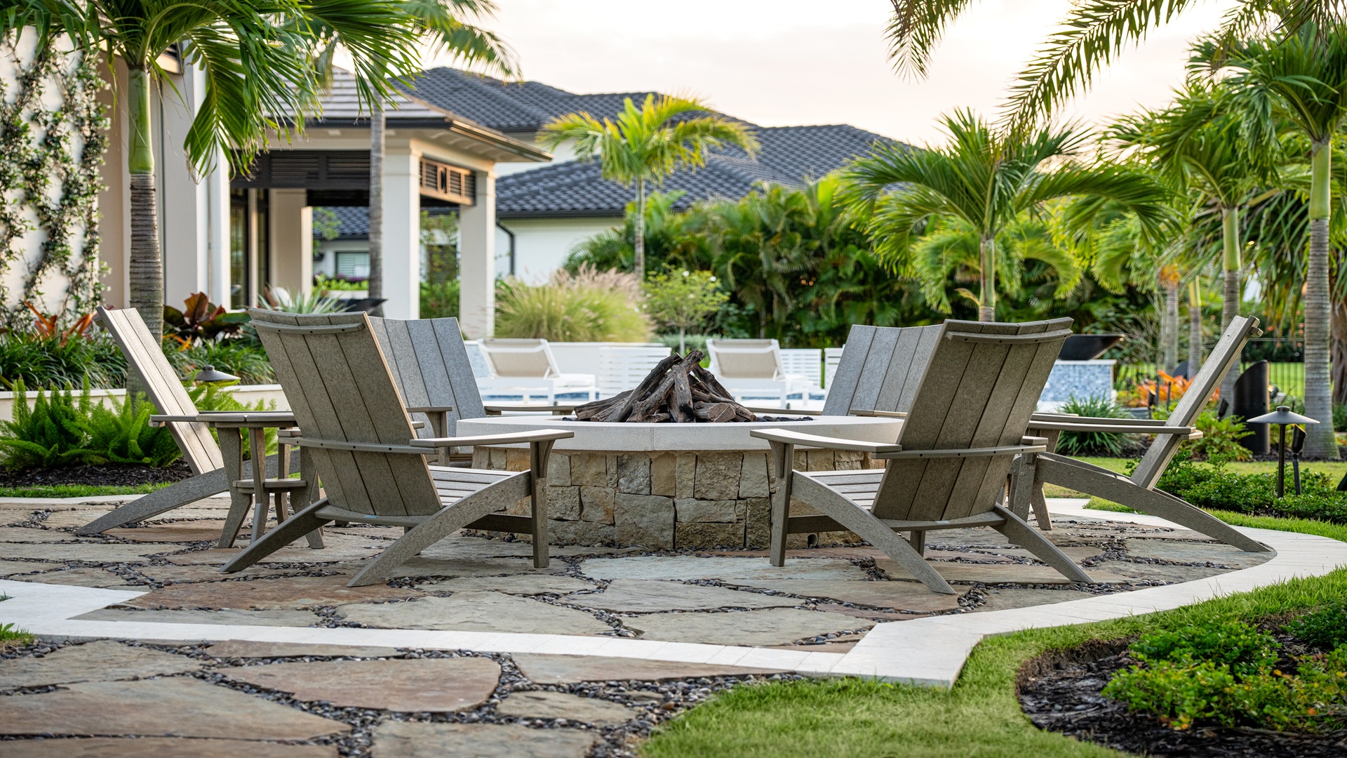 Brushed shellstone pavers span covered areas and the pool deck, adding to continuity of design. Landscaping, lush grassy areas and built-in planters soften the hardscape. A ledgestone pathway leads from the lanai to a secluded stone-clad firepit with a precast ledge and generous seating area covered in large flagstone.