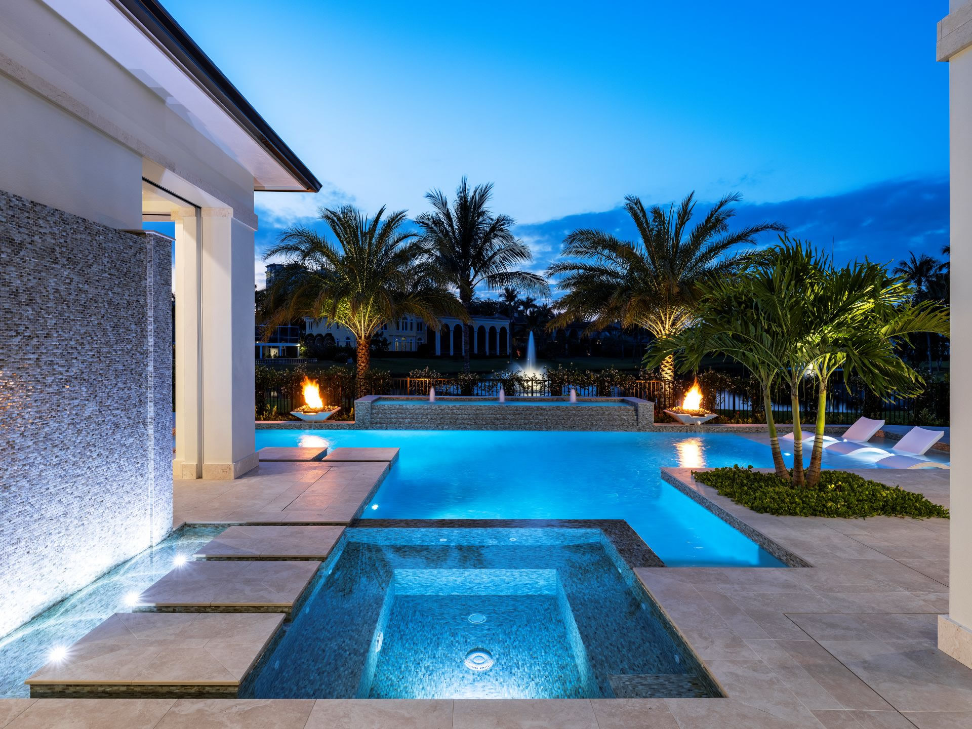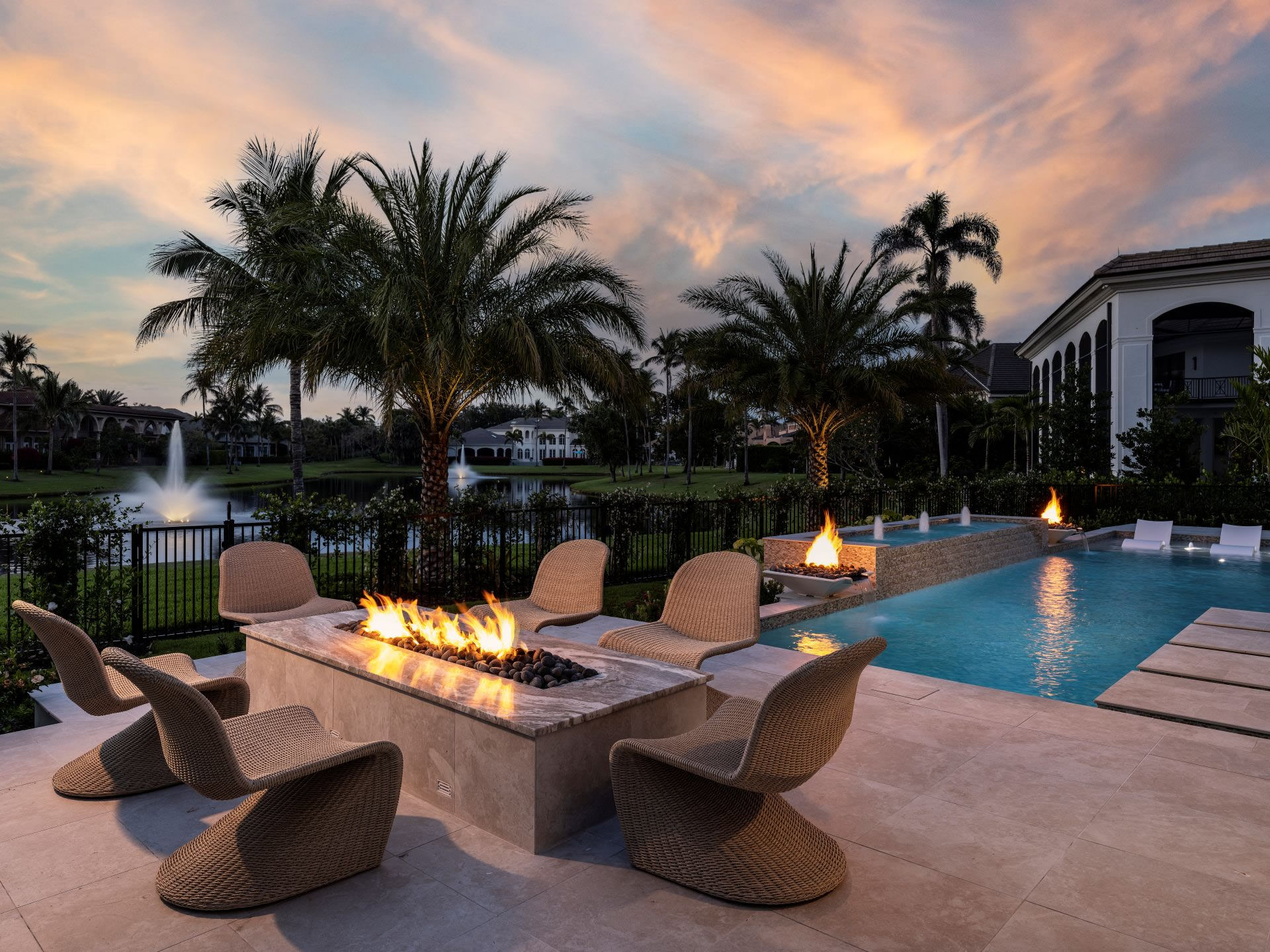 The custom pool area includes a marble topped fire table and dramatic water features while surrounded by modular rattan seating.
