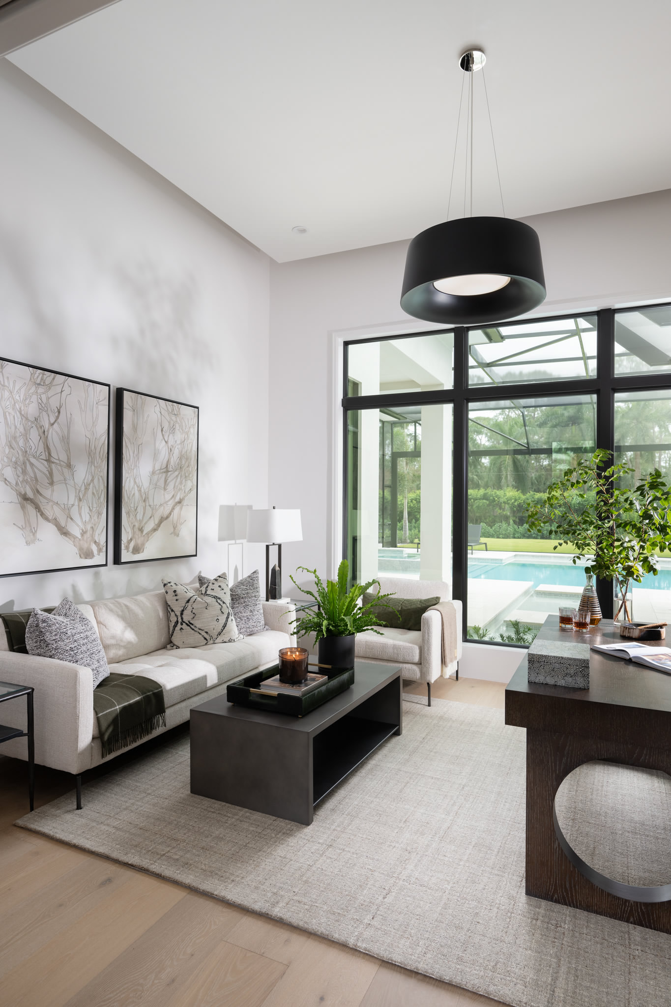 Tucked away yet visually expansive, the Study is a hidden gem that masterfully balances form, function, and tranquility – an inspired fusion of retreat, den, and creative sanctuary. This thoughtfully designed space offers arguably the best view in the home, framed by sweeping windows that open to a 1,204-square-foot Outdoor Living area. From this vantage point, the eye is drawn to a serene pool and spa, set against a natural backdrop of towering trees and curated landscaping that shifts softly with the movement of sunlight.